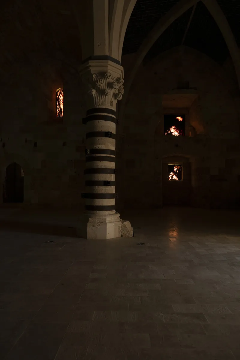 Per la sala Ipostila del Castello, invece, l’artista ha creato il ‘Post Fata Resurgo’, che si traduce in ‘dopo la morte, risorgo’, un’installazione immersiva e scenografica che simula un incendio, partendo dalle immagini dell’omonima performance in cui l’artista incendia le enormi sculture fatte di filamento metallico.